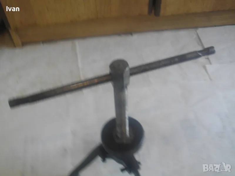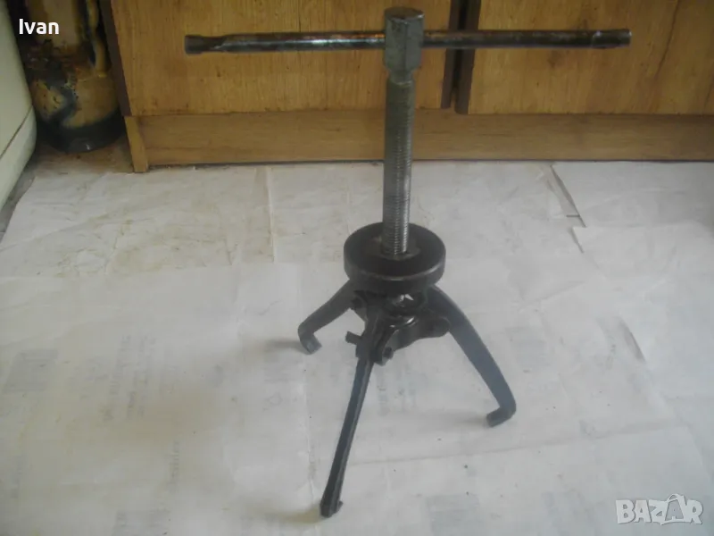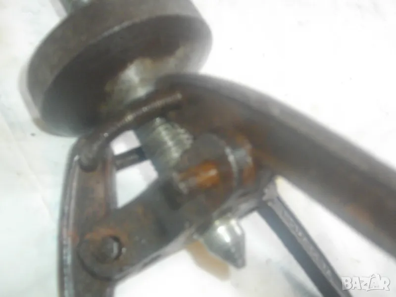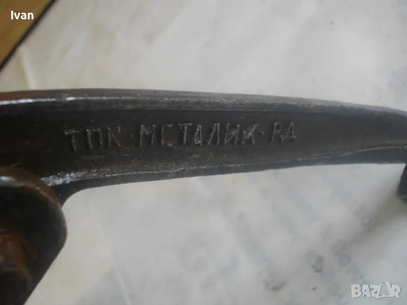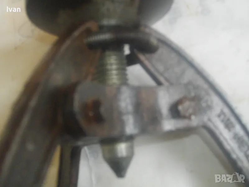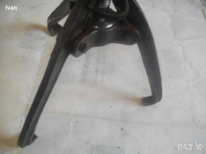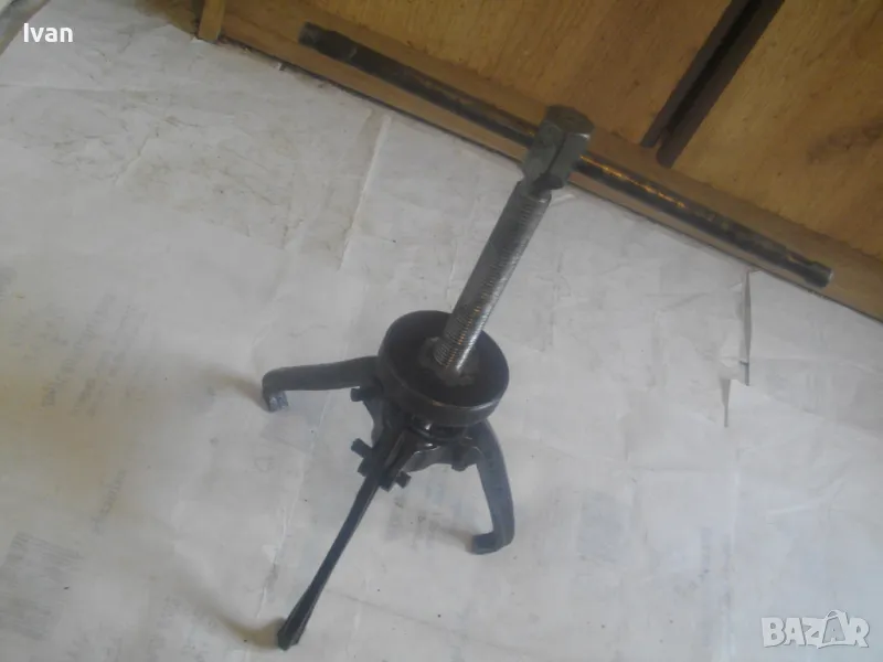 Голяма, масивна, трираменна скоба за вадене на лагери, старо Соц българско производство от годините на НРБ. Маркировка производител - ТПК Металик - гр.Разград. Скобата е от масивна плътна инструментална закалена стомана, от стария материал. Скобата е висок клас Соц производство. Маркировки ТПК Металик Р-Д ст40 - 150 - 20лв. Трираменна, масивна. Плътно дебело желязо на рамената. Захват за вадене на лагери 40-150 мм. Дължина от главата на рамената до до долу - 23 см. Дължина на винта изцяло - 28 см. Пружини на рамената за бърз захват. Захват отгоре на винта - квардарт М24 с прорези за върток. Оригиналният върток с дължина 29 см е наличен. Цялостна дължина на скобата с изцяло отворен винт 40 см. Разстояние между отделните челюсти рамена - 10 см. Захват на лагери до ф150мм. Скобата е почти нова, в добро работно състояние. Пружинния механизъм отваря и затваря съвсем леко, без никакво запъване. Винтовият механизъм има леко износване на резбата по средата на винта и на това място /около 2 см/върви тежко, по останалата дължина на винта резбата върви съвсем леко и бързо. Масивен метален стопер кръгъл над рамената. Тегло на скобата - 3,0 кг.