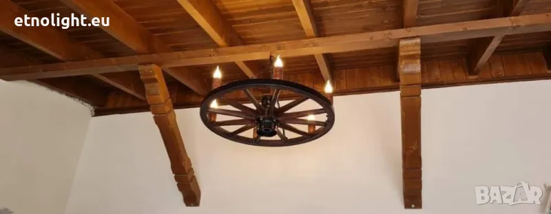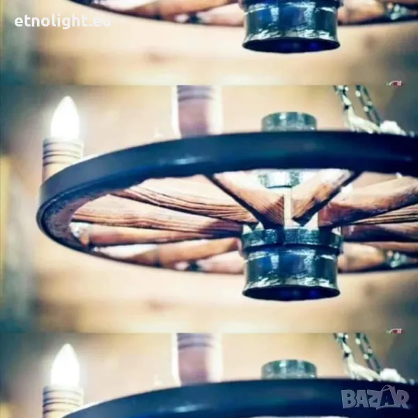 Полилеи, осветление от автентични реставрирани колела от каруца с дървени чашки → Обява 49455496
