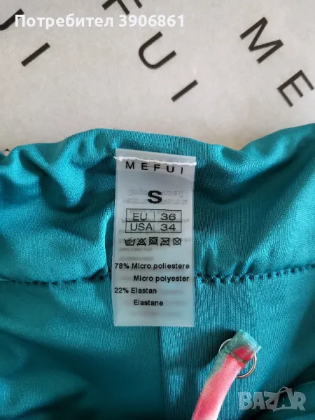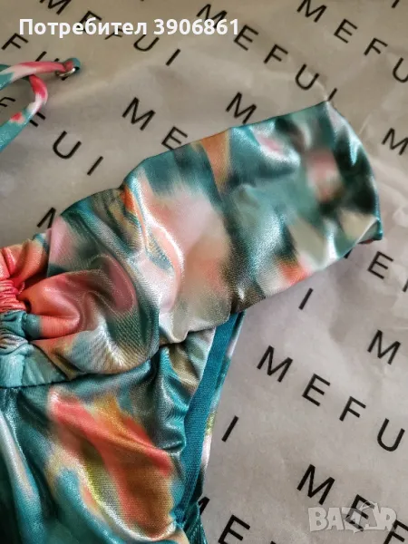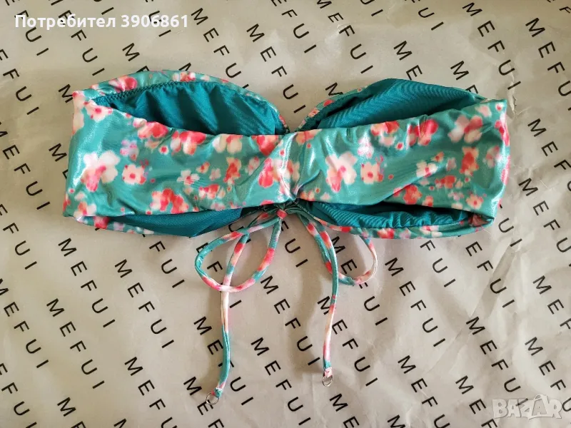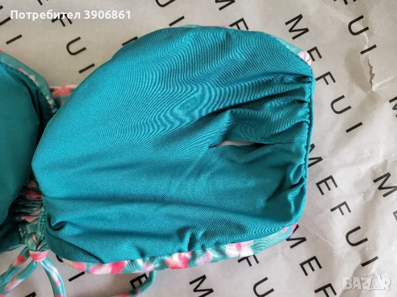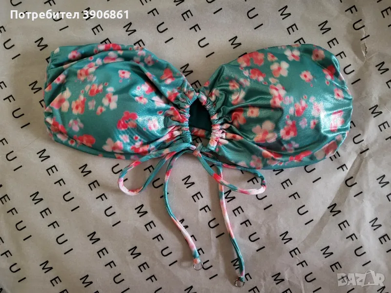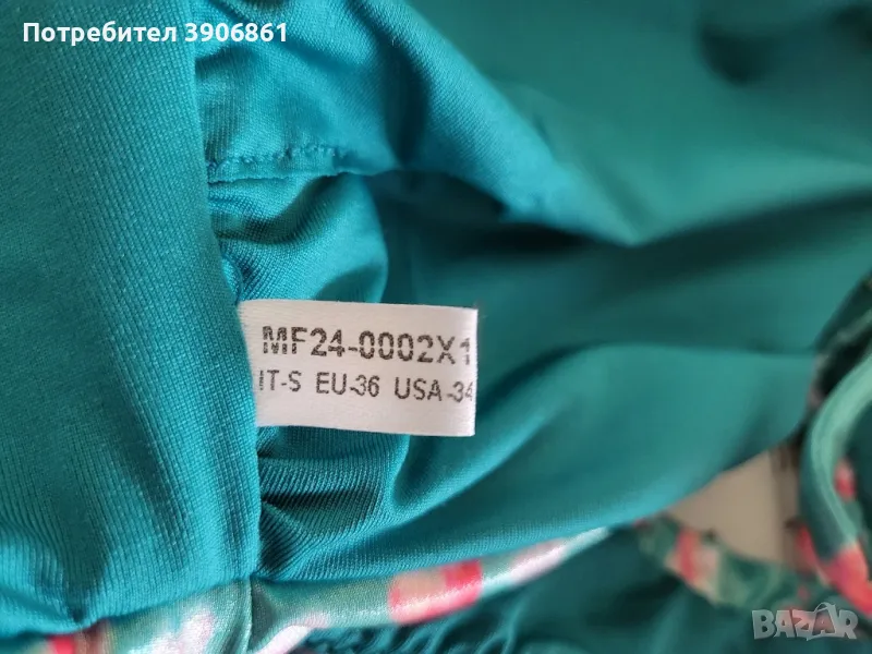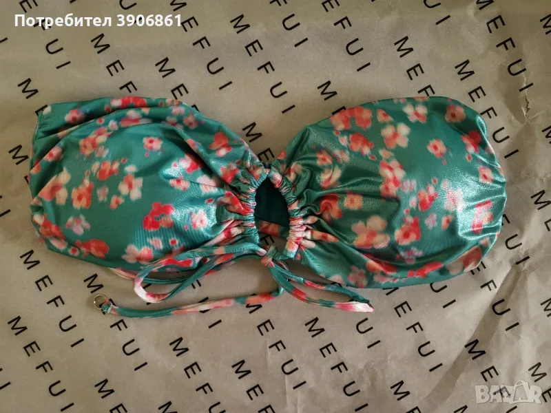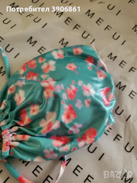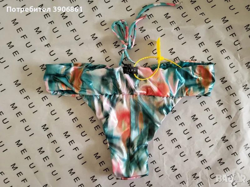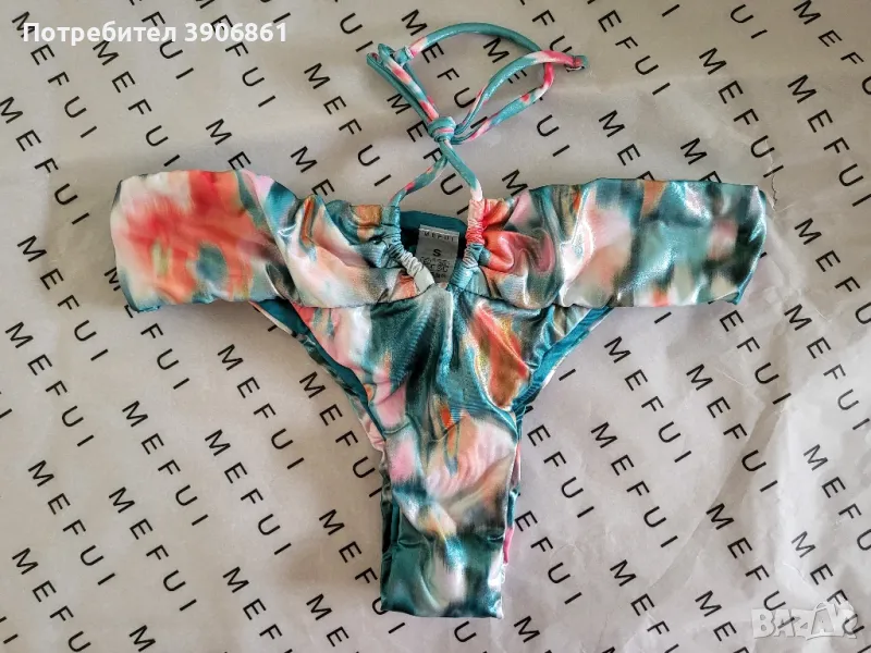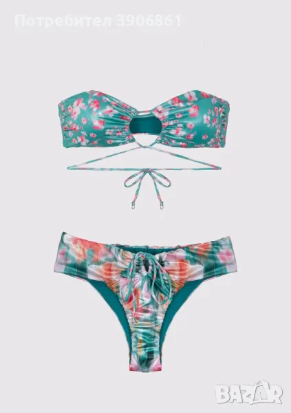 Италиански бански тип бандана с американски бикини.Щампован сатениран плат от ликра - фантазия.Връзки на горната и долната част.Подвижни подплънки.Размер S