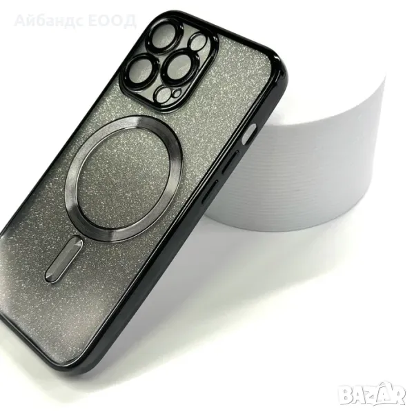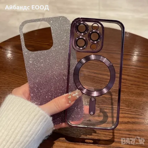 блестящ кейс айфон, glitter magsafe case, калъф с магнитен пръстен, camera lens guard, метална рамка камера, sparkly case, luxury case iPhone, Pro/Pro Max, защитен кейс с MagSafe, clear glitter cover.