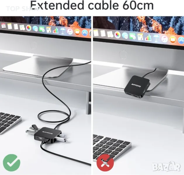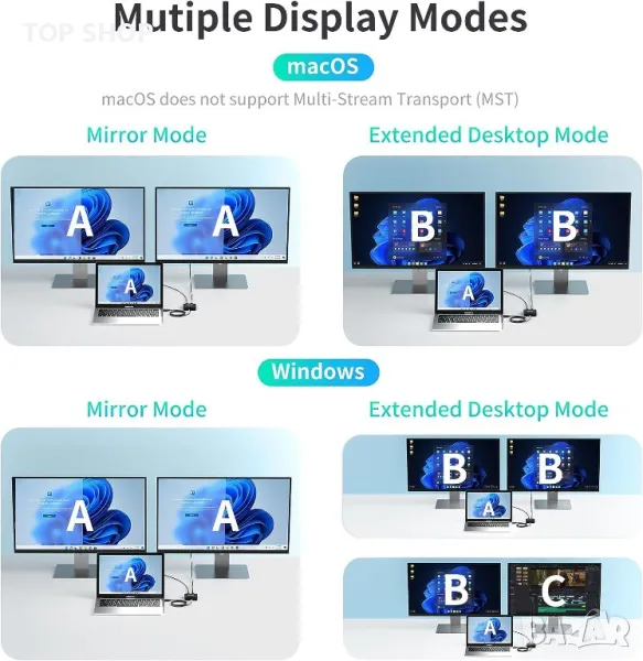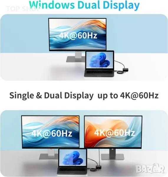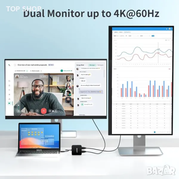 Моля използвайте системата за съобщения! Просто изпратете запитване. По телефона се губи време за уточняването на търсения от Вас продукт.Този USB-C хъб е оборудван с два HDMI порта, които поддържат разделителна способност до 4K при 60Hz. Това означава, че можете да свържете два външни монитора или дисплея към вашия лаптоп или устройство едновременно. Можете да използвате тези монитори, за да разширите своя работен плот, да отразявате екрана си или да ги конфигурирате за различни приложения като презентации, игри и настройки за домашно кино. Хъбът включва USB-C PD порт, който поддържа до 100 W захранване. Това ви позволява да зареждате своя USB-C лаптоп или устройство при високи скорости, докато използвате хъба за пренос на данни и извеждане на дисплея. Това е особено полезно за лаптопи като MacBook Air/Pro и подобни продукти. В допълнение към HDMI и USB-C PD портовете, хъбът разполага с два USB-A 3.0 порта и USB-C порт за пренос на данни. Тези портове осигуряват бързи скорости на трансфер на данни до 5Gbps, което го прави удобно за свързване на външни устройства като USB устройства, клавиатури, мишки и др. Обърнете внимание обаче, че USB-A портовете не се препоръчват за целите на зареждане, тъй като осигуряват 5V/0,9A захранване. Хъбът се предлага с кабел с дължина 60 см, който е идеален за свързване на вашия лаптоп или компютър към отдалечен телевизор или монитор. Дължината на кабела осигурява гъвкавост и удобство при различни сценарии на използване. USB C хъбът е съвместим с набор от операционни системи, включително Windows 7 или по-нова, Linux и macOS 10.3 или по-нова. Хъбът поддържа двоен HDMI изход при 4K/60Hz, ако вашият лаптоп поддържа DP 1.4. Въпреки това, ако вашият лаптоп поддържа само DP 1.2, максималната разделителна способност за всеки HDMI порт е ограничена до 4K/30Hz.