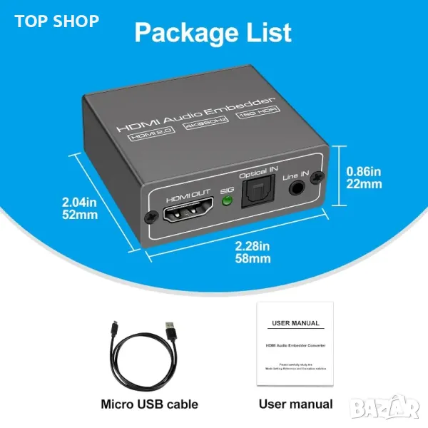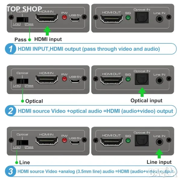 Лесно заменете HDMI аудио с външни цифрови (TOSLINK/SPDIF) или аналогови (3,5 мм) източници, с опция за превключване между тях без местене на кабели. Можете също така да изберете да запазите оригиналния HDMI аудио с помощта на функцията за преминаване. Той поддържа разделителни способности до 4K@60Hz и разнообразие от аудио формати, включително PCM, LPCM, Dolby и DTS. Устройството е съвместимо с HDR, Dolby Vision и HDCP 2.2/1.4 и работи безпроблемно с HDMI и DVI сигнали. Той е plug-and-play, без да е необходим софтуер, което го прави идеален за различни HDMI настройки. (Имайте предвид, че оригиналният HDMI звук е заменен, а не смесен с оригиналния HDMI звук.)