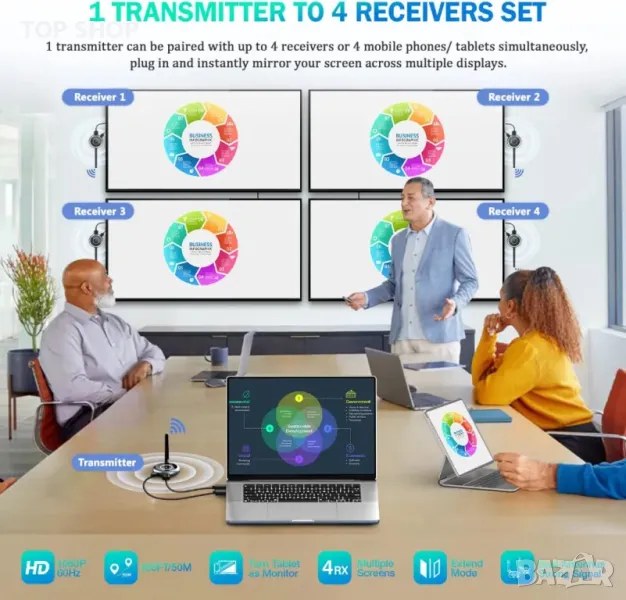 AIMIBO Wireless HDMI Extender поддържа свързване на предавател (TX) към до 4 приемника или мобилни устройства, което позволява висококачествено видео и аудио поточно предаване към множество дисплеи в обхват от 30 метра, идеално за конферентни зали и класни стаи. Включва 1 предавател и 3 приемника, с възможност за използване на вашия смартфон или таблет като допълнителен дисплей чрез приложението RScreen. Plug-and-play настройката е удобна за потребителя, не изисква Bluetooth или Wi-Fi и разполага с мощен 5GHz чип за 1080P@60Hz видео със закъснение от 0,1 секунди. Съвместим с различни HDMI устройства, той поддържа стрийминг от лаптопи, компютри, кабелни кутии, игрови конзоли и популярни видео услуги като Netflix и Disney Plus.