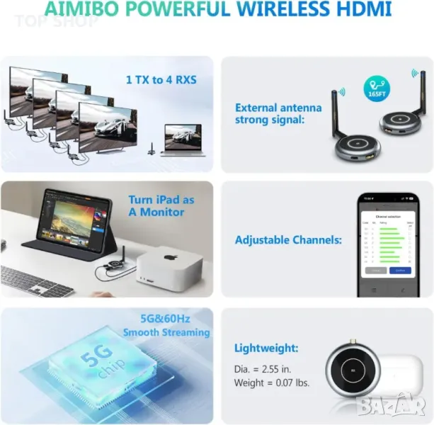 Безжичен HDMI предавател AIMIBO и 3 приемника, 30M няколко телевизора с приложение, огледало, 5.8G