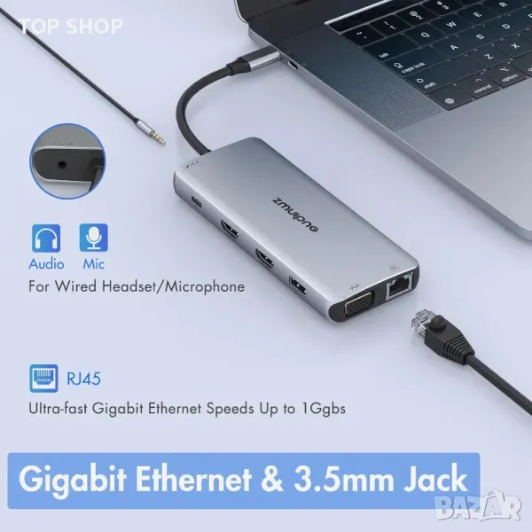 Тази докинг станция разполага с множество портове, включително 2 HDMI, VGA, 2 USB 3.0, 2 USB 2.0, Gigabit Ethernet, 100 W захранване и четец на SD/TF карти, което позволява едновременно използване на всички портове. Той поддържа дисплеи с двоен и три монитора с разделителна способност до 4K@60Hz за използване на един HDMI и 1080P за три дисплея. Устройството позволява бърз трансфер на данни с plug-and-play функционалност, без да изисква допълнителен софтуер. С максимална входна мощност от 100 W и безопасна изходна мощност от 87 W, той осигурява ефективна доставка на енергия, а неговият Gigabit Ethernet порт предлага стабилна мрежова връзка. Съвместим с различни лаптопи, включващи пълнофункционални USB-C портове, важно е да проверите съвместимостта на устройството преди покупка.