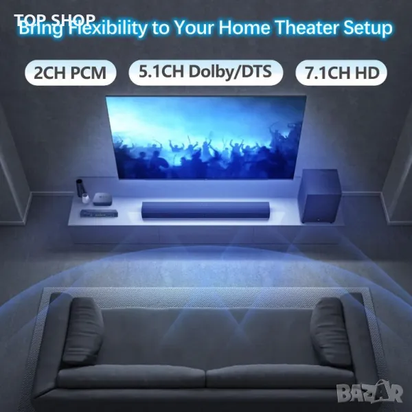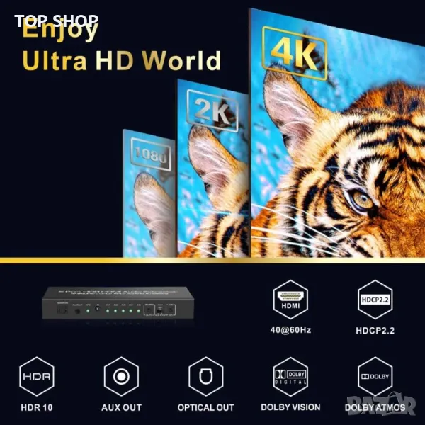 Apple TV 4K, Blu-ray плейър) към един HDMI порт на вашия HDTV, монитор или проектор. Той извлича аудио от HDMI и извежда чрез оптичен и 3,5 мм жак към високоговорители, слушалки, приемници и звукови ленти. С 3 EDID аудио настройки, той поддържа 2CH LPCM/PCM стерео, 5.1CH Dolby Digital/DTS и Dolby HD/DTS HD/Dolby Atmos. Устройството поддържа 4K@60Hz, 1080P@120Hz, HDR10, Dolby Vision и 18Gbps предаване. Функцията ARC изпраща телевизионно аудио към системи, различни от ARC, чрез оптични и HDMI портове (не 3,5 мм жак). Лесно превключване между устройства с автоматични и ръчни опции; автоматичното превключване може да бъде деактивирано. Пакетът включва HDMI Switch Audio Extractor, IR дистанционно, захранващ адаптер и ръководство за потребителя.