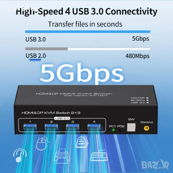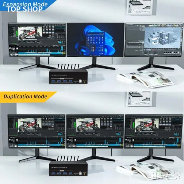 Подобрете вашата работна станция с усъвършенстван KVM превключвател, включващ HDMI вход и два DisplayPort порта за безпроблемно управление на устройството. Насладете се на зашеметяващата 8K резолюция при 60Hz за несравнима визуална яснота. Изход на три монитора едновременно, идеален за многозадачност в дизайна, финансите и игрите. Възползвайте се от високоскоростен трансфер на данни до 5Gbps с четири USB3.0 порта. Използвайте разширен режим за разширено работно пространство или режим на копиране за дублиране на съдържание на дисплеи, оптимизиране на продуктивността и гъвкавостта за всяка професионална среда.