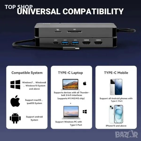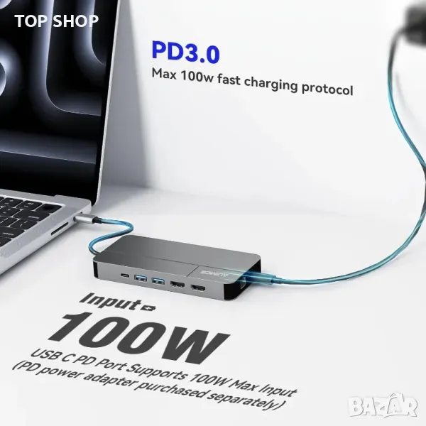 Тази USB-C докинг станция поддържа MST разширен дисплей за macOS устройства с всички чипове на Apple (M1/M2/M3/M4), изискващ SMI драйвер за безпроблемна настройка. Освен това е съвместим с Windows USB-C лаптопи и системи като macOS, iPadOS, Windows 7-10, Android и основни марки лаптопи. Оборудван с многофункционални портове, той включва 100W PD USB-C порт, USB-A и USB-C портове за данни (до 10Gbps), два HDMI порта (4K/60Hz), Gigabit Ethernet, слотове за SD/TF карти и 3,5 мм аудио жак. Програмата SMI macOS InstantView предлага функции като отключване на Apple Watch и HiDPL контрол. Лек и преносим, той е проектиран за безпроблемна употреба и организирано работно пространство.
