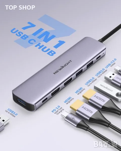 USB C към HDMI адаптер, Newmight 7 в 1 USB C докинг станция с 2 HDMI, 3 USB3.0, 100 W PD, USB C 3.0
