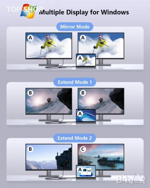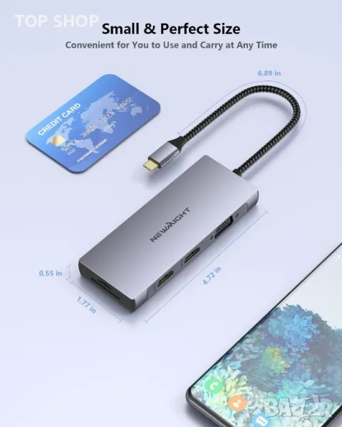 Моля използвайте системата за съобщения! Просто изпратете запитване. По телефона се губи време за уточняването на търсения от Вас продукт.Този USB C хъб е универсално решение за разширяване на Type-C порта на вашия лаптоп с 2 HDMI, 1 VGA, 3 USB 3.0 порта, 100 W порт за бързо зареждане и слот за четец на SD/TF карти. Той предлага plug-and-play функционалност за подобрена работна ефективност. Насладете се на двоен HDMI изход с поддръжка за 1080P@60Hz на два монитора едновременно или 4K@30Hz на един монитор. Хъбът също така разполага със 100W PD зареждане, бързи USB 3.0 скорости на трансфер на данни до 5Gbps и удобен четец на SD/TF карти. Той е съвместим с широк набор от USB-C устройства, което го прави ценно допълнение към вашата настройка.