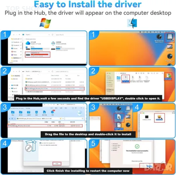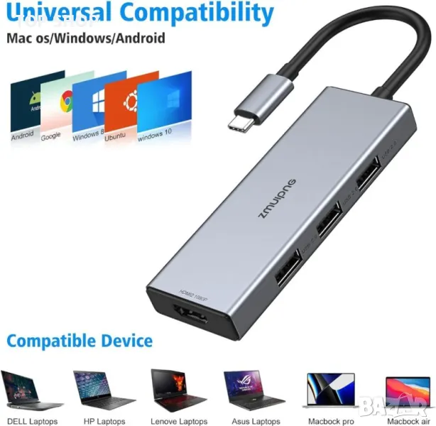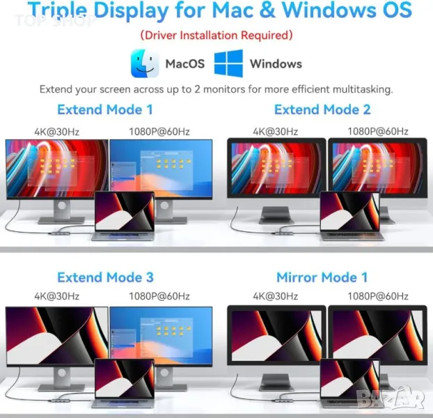 Тази USB C докинг станция трансформира един USB C/Thunderbolt 3/4 порт в мултифункционален хъб с двойни HDMI изходи (4K@30Hz & 1080P@60Hz), 100W USB C Power Delivery и три USB 2.0 порта (480Mbps). Той поддържа двойни настройки на дисплея в Windows и macOS, като предлага както SST, така и MST режими, и позволява дублиране на екрана или разширение с изход с висока разделителна способност. В допълнение, той включва възможности за бърз трансфер на данни и порт за зареждане, който поддържа до 100 W вход и 87 W изход. Съвместим с различни модели лаптопи, включително Dell XPS, Latitude, HP Elitebook, ZBook, MacBook Pro и MacBook Air, изисква инсталиране на драйвер, както е описано в ръководството за потребителя.