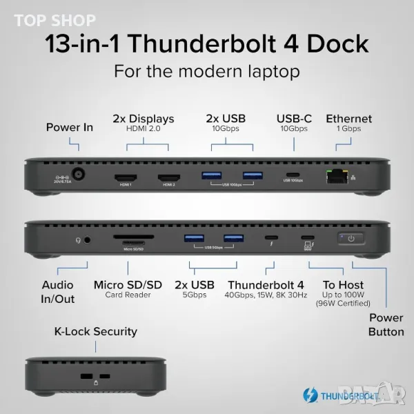 Докинг станцията, сертифицирана с Thunderbolt 4, включваща двойни 4K 60Hz HDMI и 8K възможности, заедно с до 100W захранване (96W сертифицирано). С общо 13 порта, включително Thunderbolt 4 нагоре и надолу по веригата, този хъб осигурява безпроблемно свързване и зареждане за вашите устройства. Насладете се на подобрена производителност с двойни 4K дисплеи или един 8K дисплей, всички с висока честота на опресняване. Сертифицирана за Thunderbolt 4, тя предлага светкавично бързи скорости на трансфер на данни до 40Gbps. Съвместима с Windows 10 или по-нови системи и на системи Mac двойният дисплей се поддържа само на системи M1 Pro/Max, M2 Pro/Max и M3 Pro/Max, това е най-доброто решение за многостранна свързаност и ефективна многозадачност.