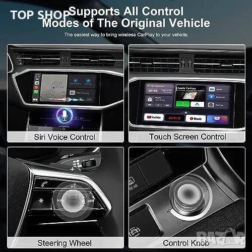 Съвместимост: Поддържа 98% от автомобилите с фабричен CarPlay (2017-2023), изключение BMW. Съвместим с iOS и Android.