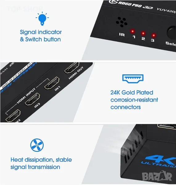 HDMI превключвател 3 в 1 позволява да свързвате и превключвате между три HDMI устройства с помощта на един HDMI изход.