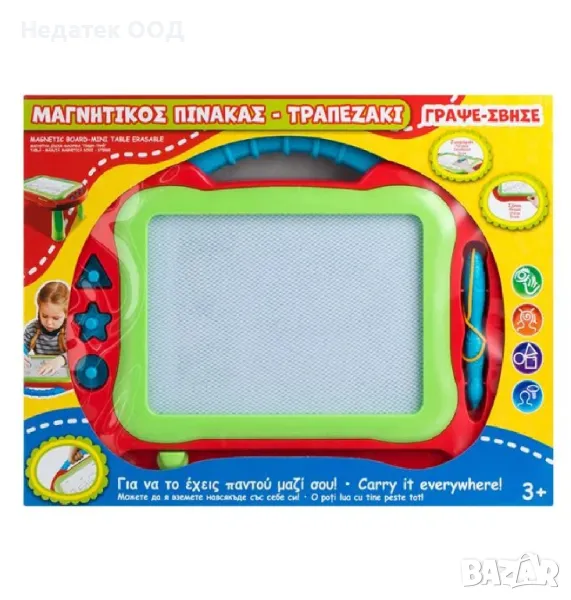 Дъска "Пиши - Изтрий" в зелено и червено, със сини детайли и дръжка за лесно транспортиране. Свържете 4-те крака, за да създадете маса-маса. Разполага със специална магнитна химикалка и 3 печата - магнити във формата на триъгълник, звезда и кръг. Рисувайте, рисувайте, пишете, изтривайте и започнете отначало.