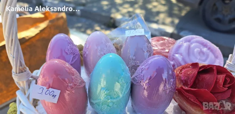 Домашен ръчно изработен сапун във форма на Великденско яйце в различни цветове и аромати. Клиента може да избере от аромати на люляк,франджипани или лавандула и цветове без ограничения.Сапините са изработени изцяло с естествени продукти и натурални етерични масла.