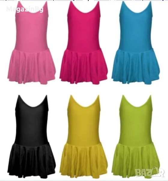 5* Детско трико с тънки презрамки и поличка. Презрамките се регулират в зависимост от ръста на детето. Подходящо за гимнастика, танци и балет. Материал: 70% полиестер, 30% ликра. Цвят: различни цветове.