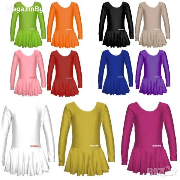 2* Детско трико с дълъг ръкав, пришита поличка и обло деколте. Подходящо за гимнастика, балет и танци. Трикото е изработено от изключително мек и приятен материал, съобразен с нежната кожа на децата. Материал - 70% полиестер, 30% ликра. Цвят - различни цветове. Различни размери, които съответстват на височината на детето, както следва: размер XL - за ръст 110 см, размер 2XL - за ръст 120 см, размер 3XL - за ръст 130 см, размер 4XL - за ръст 140 см, размер 5XL - за ръст 150 см, размер 6XL - за ръст 160 см.