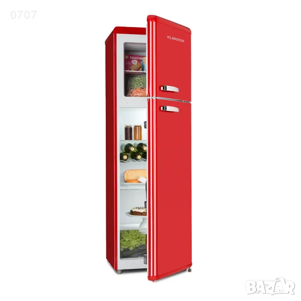 Време е за промяна, време е за рокендрол в кухнята: с Klarstein Audrey Retro ретро хладилник фризер, 50-те години идват в модерната кухня! Уредът се връща към 50-те години на миналия век, осигурява достатъчно място за съхранение на прясна и замразена храна и визуално се придържа към популярния ретро вид. С обем от 194 литра в хладилната част, уредът отговаря на всички ваши желания за съхранение на пресни храни. 3 стъклени рафта и поставка за бутилки спретнато организират доставките и могат да се охлаждат до температура от 0 до 10 °C. Разширената зона на свежест поддържа плодовете и зеленчуците при температура от почти 0°C, така че те остават свежи и хрупкави още по-дълго. В отделенията с 4 врати също има място за бутилки от напитки, буркани за сладко, 12 яйца и много други. С обем от 56 литра, хладилникът-фризер Klarstein Audrey Retro предлага много място за замразени пици, чипс, зеленчуци, сладкиши или предварително приготвени ястия. При температура от -18 до -24 °C храната може да се съхранява във фризер с четири звезди в продължение на няколко седмици. Свежест в рокендрол форма: с комбинацията хладилник-фризер в ретро стил от Klarstein Audrey Retro, кухнята се превръща в истинско ретро бистро от 50-те години на миналия век