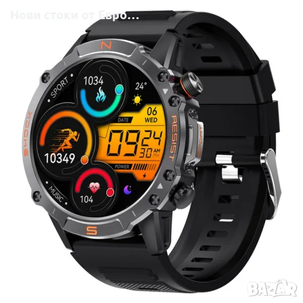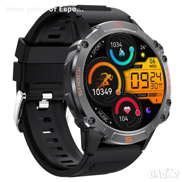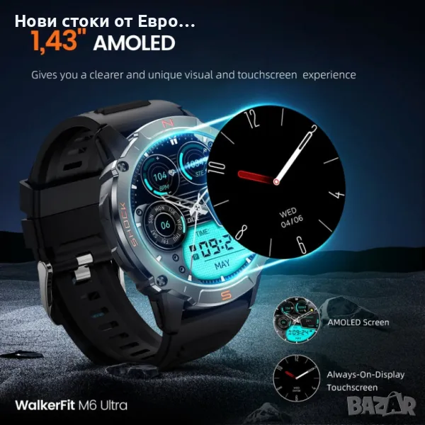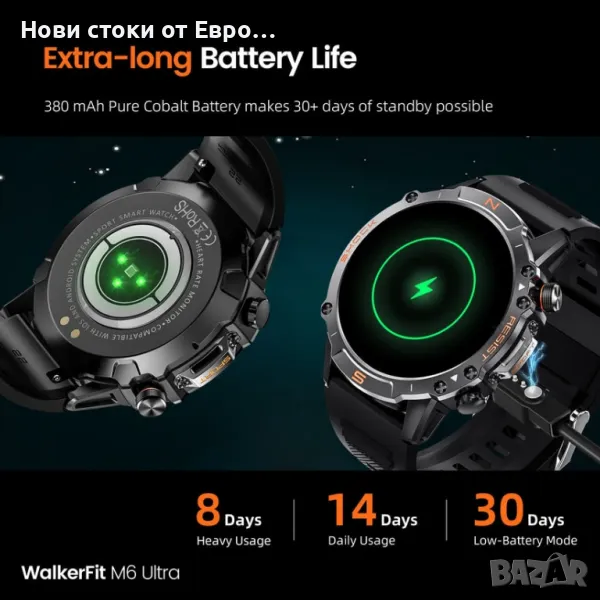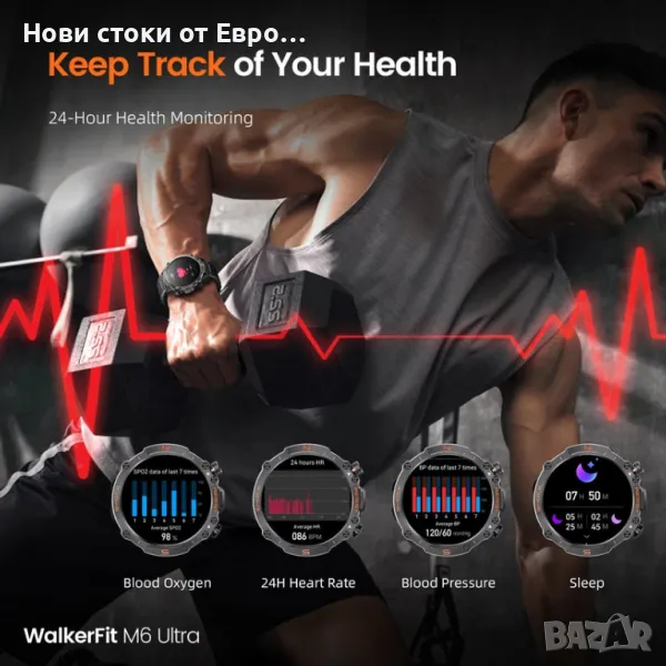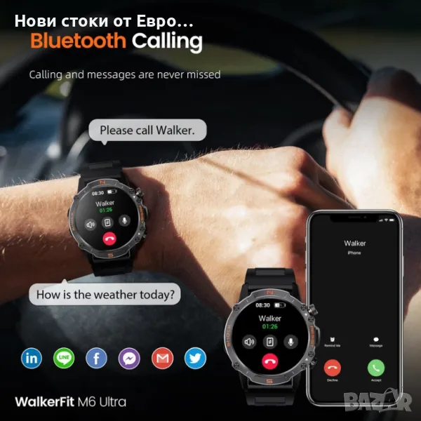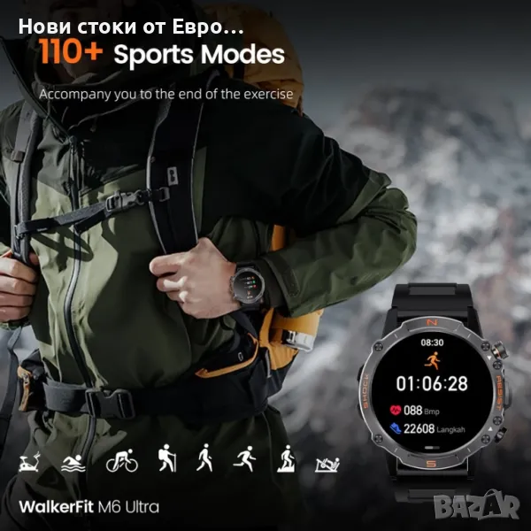 M6 Ultra Smartwatch с метална каишкаСъздаден за издръжливост Умният часовник WalkerFit M6 Ultra разполага с невероятно здрав и устойчив на корозия метален корпус, който го предпазва и при най-тежки условия. Проектиран да издържа на строги тестове, той издържа: 72 часа солен спрей 50 000 натискания на бутони Екстремни температури (-40℉ до 158℉) Водоустойчив до 30 метра 100 падания от 2 метра Този здрав смарт часовник ви дава възможност да поемете с увереност всяко приключение. Изключителен живот на батерията До 2 седмици при редовна употреба До 60+ дни в енергоспестяващ режим с основни функции като проследяване на спорт и наблюдение на здравето 24-часово проследяване на пулса с данни за пулса в покой Измерване на кислород в кръвта за по-задълбочена представа за вашето здраве Мониторинг на съня и дихателни упражнения, които да ви помогнат да останете спокойни и концентрирани Гласов асистент & Функционалност на обаждането Взаимодействайте със свободни ръце с гласовия асистент с изкуствен интелект. Използвайте гласови команди, за да задавате въпроси, да пускате музика, да проверявате времето и дори да осъществявате повиквания, което прави ежедневните ви дейности безпроблемни и ефективни. Подобрете вашето фитнес пътуване и начин на живот със смарт часовника WalkerFit M6 Ultra. Изпитайте издръжливост, производителност и удобство – всичко в едно.
