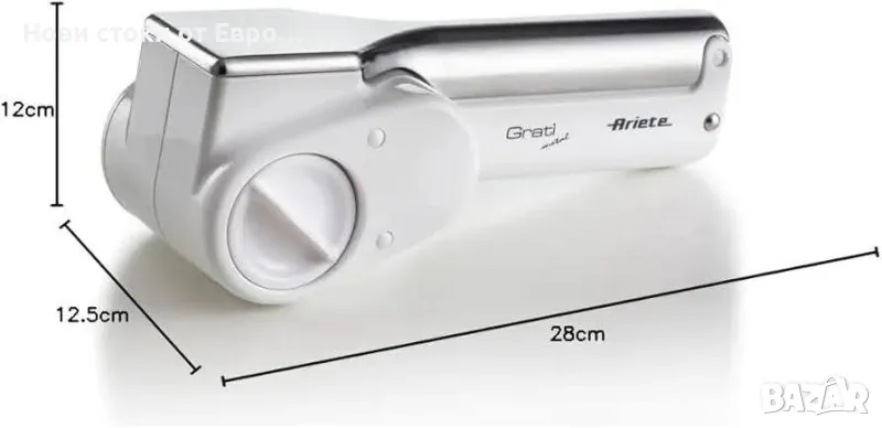 електрическо ренде - 1 кг сирене с 1 пълнител - 2 ролки с големи и фини дупки - бяло и сребристоБЕЗЖИЧНО: настържете сиренето върху вашата паста директно на масата благодарение на това захранвано с батерии електрическо ренде НЕ САМО СИРЕНЕ: благодарение на двете доставени ролки от неръждаема стомана можете също да настържете сух хляб, шоколад и сушени плодове УДОБНО: благодарение на бутона за активиране на алуминиевата дръжка, просто го натиснете и той ще започне да стърже ВИНАГИ ГОТОВ: благодарение на батерията от 1500 mAh, Gratì Ariete настъргва до 1 кг сирене, без да е необходимо презареждане на батерията; винаги ще имате на разположение машината за сирене, пълна с прясно настъргано прясно сирене ARIETE DESIGN: дизайнът Gratì е същият като емблематичния продуктов символ на марката Ariete, но днес моторът и батериите са авангардни, за да ви гарантират функционален и много лесен за използване продукт