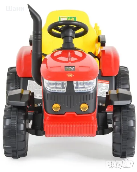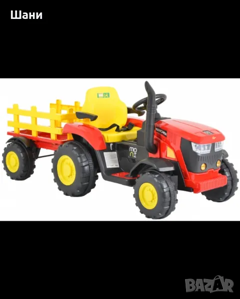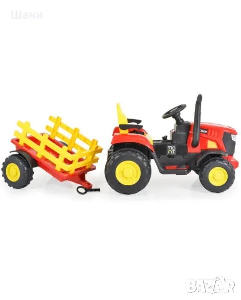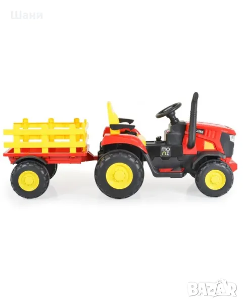 Акумулаторният трактор от Moni ще се хареса на всеки малък любител на превозните средства. Играчката е с реалистичен дизайн и има 4 пластмасови гуми. Тракторът е оборудван с бутон за клаксон на волана, предни светлини, предпазен колан и ремарке. Може да се движи напред и назад и има три скорости на движение, които се регулират от дистанционното управление. За още по-голямо забавление тракторът е с музикални функции и разполага с порт за USB и MP3.