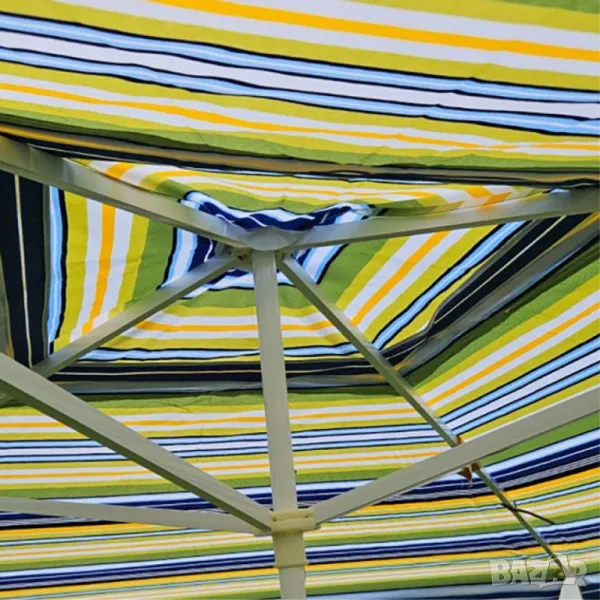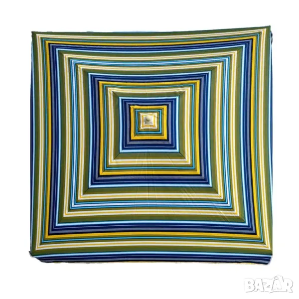 чадър с атрактивен многоцветен дизайн на ивици, подходящ за градина, балкон, тераса или плаж. Здравата метална конструкция и полиестерното покривало осигуряват стабилна защита от слънце и лек дъжд. Височината се регулира на три нива (2.00 м, 2.70 м и 2.90 м), позволявайки лесна адаптация според нуждите ви. Чадърът се сгъва до компактни размери за по-удобно транспортиране и съхранение.