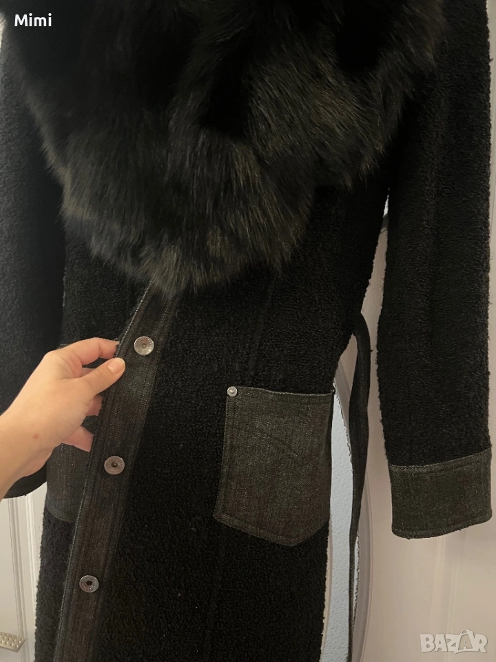 Страхотно дизайнерско палто от букле с черни дънкови детайли има естествена богата яка с много стил и класа съчетано заедно което го прави уникален модел използвано е малко без забележки размер XS/S