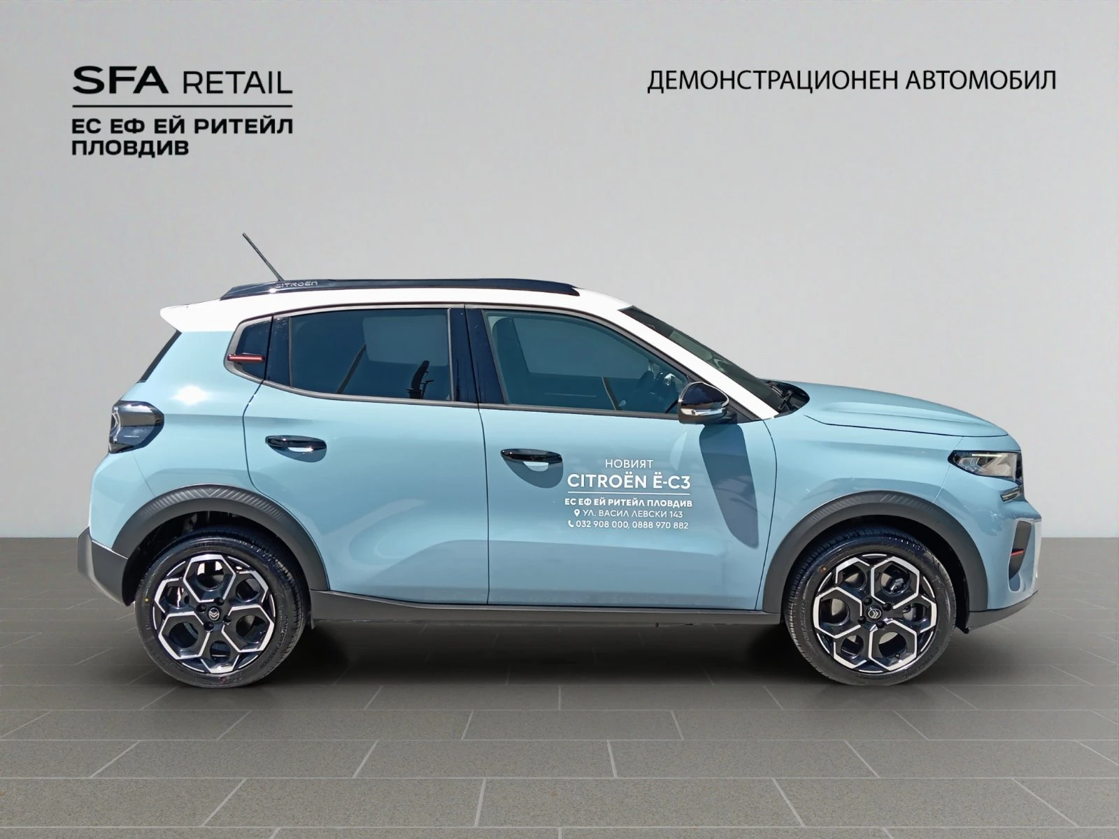 Демонстрационен автомобил на Ес Еф Ей Ритейл - Пловдив ЕООД. Реф. 2407508 *Гаранция 5г. или 150 000 км. , което събитията настъпи първо. Стартирана на 06. 03. 25г. *Гаранция на батерията 8г. или 160 000км. , което настъпи първо. *Предаване на автомобила 06. 25г. Примерна месечна вноска при финансов лизинг 324. 99 евро / 635. 62 лв при 20% първоначална вноска + ДДС и без остатъчна стойност за 60м. Лица за контакти: Иван Иванов 0887501566 Петър Аргиров 0887501457 Петър Янакиев 0886499339 Николай Георгиев 0889601800 *АУДИОКОМУНИКАЦИЯ -3 броя USB (USB тип C за зареждане отпред на централната конзола + 2 броя USB тип С за зареждане отзад) -6 тонколони -Citroеn Head up дисплей (TFT Приборен панел Citroеn Reflection Unit (CRU)) -My CITROEN Drive (Навигация на 10'' HD сензорен екран, информация за трафика в реално време, безжичен Mirror Screen (Android Auto и Apple CarPlay ), радио MP3 с цифров радиотунер, уравление от волана. Hands Free Bluetooth, e-Call (спешни обаждания), b-Call (пътна помощ на Citroеn)) -USB (тип С за зареждане + данни, отпред) -Безжично зареждане на смартфон -Дистанционно управление на зареждането (изисква приложение MyCITROEN и абонамент) -Индикатор за външна температура -Предварителното климатизиране на купето (изисква приложение MyCITROEN и абонамент) -Трип компютър *ЕКСТЕРИОР -B и С -колони в черен лак -Арки на калниците в черен цвят -Брони в цвета на купето -Дръжки на вратите в цвят Noir Perla Nera -Лайстни на страничните стъкла черен мат -Пакет Color Andre Red (с цветове Bleu Montecarlo и Blanc Banquise) -Пакет Color Blanc Banquise (с цветове Noir Perla Nera и Gris Mercure) -Пакет Color Neon Lemon (с цвят Rouge Elixir и Bright Blue) -Протектори на броните в сив цвят -Релси на покрива -Черупки на огледалата в цвят Noir Perla Nera *ИНТЕРИОР -" Вътрешен декор на предните врати в цвят "" Сидерит""" -" Декор на бордно табло в цвят "" Сидерит""" -Висока централна конзола с подлакътник и жабка -Волан в синтетична кожа (декор в хром и черен лак) -Делима задна облегалка (60: 40) -Джобове на гърба на предните седалки (с допълнителен джоб за смартфон) -Затворена жабка -Контакт 12V -Кора на багажника -Регулируеми по височина задни подглавници -Регулируеми по височина предни подглавници -Тапицирани подлакътници на вратите -Фиксиращи халки в багажника -Хромирани вътрешни ръкохватки на вратите *КОЛЕЛА -" 17'' лети джанти ATACAMITE (с обработка "" диамант"" )" *КОМФОРТ И ФУНКЦИОНАЛНОСТ -Автоматичен климатик (с поленов с филтър с активен въглен) -Акустично предно стъкло -Бордови компютър -Окачване Progressive Hydraulic Cushions -Предни и задни електрически стъкла -Регулируем по дължина и височина волан -Регулируема по височина седалка на водача (включва лумбално регулиране за водача) -Централно заключване с дистанционно управление *ОБОРУДВАНЕ -Еднофазен бордови зареждащ модул 7, 4 kW -Кабел за зареждане за Wallbox ( Mode 3, 22KW, 3x32A, 6m) *ПОМОЩ ЗА ВОДАЧА -Hill Start Assist -Електроусилвател на волана с променливо усилие -Камера заден ход (включва задни паркинг сензори) -Пакет Safety (Active Safety brake (с видеокамера) + предупреждение за опасност от сблъсък, активна система за следене на пътната лента, предупредение за понижено внимание на водача, разпознаване на знаците за ограничение на скоростта и препоръка, интелигентен регулатор и ограничител на скоростта с препоръка) *СВЕТЛИНИ И ВИДИМОСТ -LED