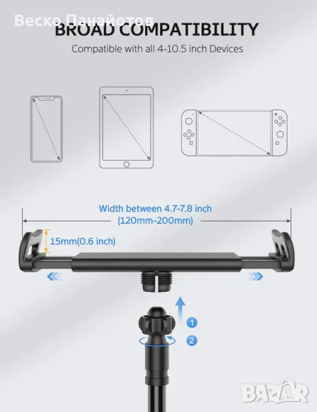 - 【ШИРОКА СЪВМЕСТИМОСТ】 Регулируемата стойка за iPad Gooseneck е съвместима с всички 4 ~10,5-инчови устройства като 2020 iPad 10.2, iPad mini 2 3 4, iPad 9.7, iPad Air 2/3/4, iPad 6th 5th 4th 3th Gen, iPhone 16 15 14 13 12 Pro Xs Max XR X Mini 11 8 7 6 6s Plus, Galaxy Tab A 10.1 10.5 9.7 8, Samsung Galaxy Tab S 8 9.7, таблет Lenovo, HUAWEI MatePad, Switch. Дори и с корпус с дебелина под 15 мм.
