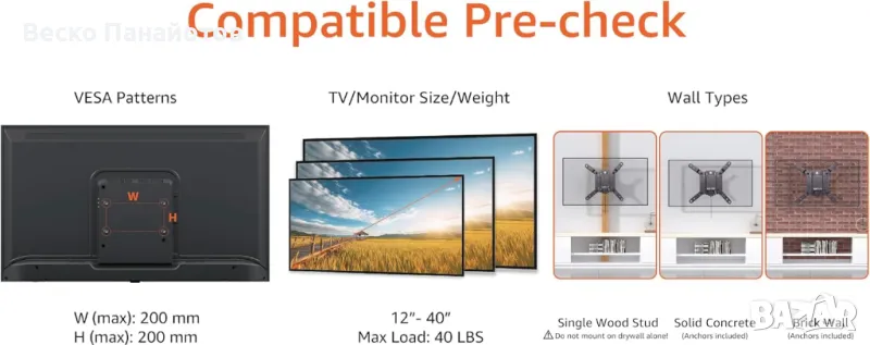 • Проектиран за телевизори до 40 lbs (18,2 KG) и размер на дисплея 12" - 40" (30,5 CM - 101,6 CM).