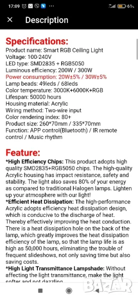 Продава се чисто нова Bluetooth лампа. Закупена е от интернет магазин ,но така и не и дойде реда да се постави. На малката й мина мерака.300w, Размери: 335мм/ 70мм68 бр. лед,С дистанционно за управление на цветовете и силата на звука и песните.За повече информация можете да ми пишете на съобщение.