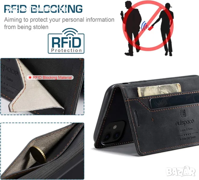 • Висококачествен материал: Изработен от текстурирана матова PU кожа и мека TPU вътрешна броня, осигуряваща висококачествено изживяване и удобно усещане при допир. RFID блокиращият материал защитава вашата информация от кражба.