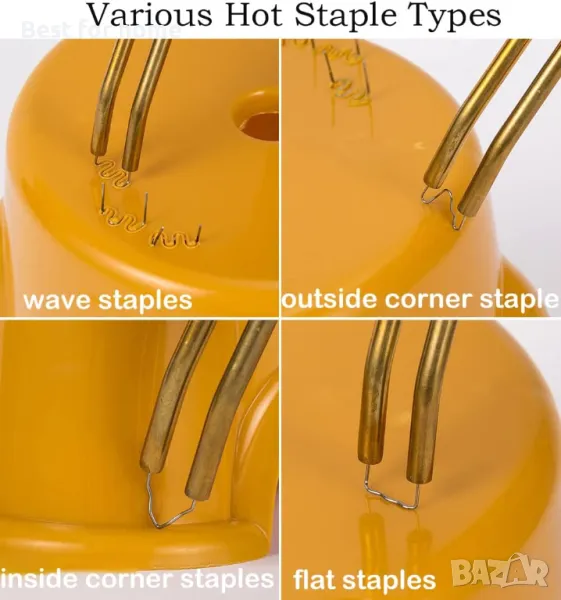 - Пакетът включва: 1* Машина за заваряване на пластмаси, 100 * Плосък телбод, 150 * Външен ъглов телбод, 100 * Вътрешен ъглов телбод (0,6 mm), 150 * Вътрешен ъглов телбод (0,8 mm), 100 * Вълнообразен телбод (0,6 mm), 200 * Вълнообразен телбод (0,8 mm), 1 * Клещи, 1 * Калъф за носене