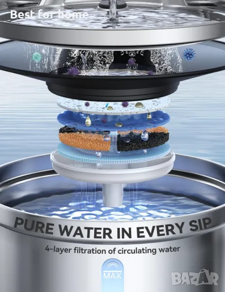- 【Система за вертикална филтрация и циркулация】 Всяка капка вода се подлага на многопластова филтрация: активен въглен за премахване на миризми, йонообменна смола за омекотяване и отстраняване на тежки метали, нетъкан текстил за улавяне на косми и замърсявания и гъба с помпа с висока плътност за елиминиране на фини частици. Това гарантира целогодишно снабдяване с прясна, здравословна вода за вашия домашен любимец. Препоръчваме смяна на филтъра на всеки 2 седмици за здравето на домашния любимец (Търсете „B0D1K826GX“ за официални филтри.)