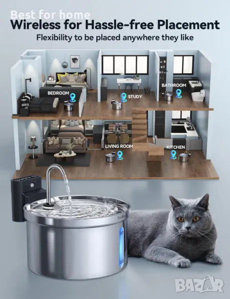 - 【Прегърнете безжичната свобода】Време е да се освободите от заплетените и опасни кабели. Насладете се на истинското удобство на безжичния воден фонтан. Независимо дали е поставен във всекидневната, спалнята или кухнята, на пода, на масата или дори на перваза на прозореца, нашият безжичен воден фонтан за котки и кучета гарантира, че вашите пухкави приятели могат да се наслаждават на прясна, течаща вода, където пожелаят, няма нужда да се притеснявате, че домашни любимци гризат кабели, прегърнете безжичната свобода и значително намалете опасностите за безопасността.