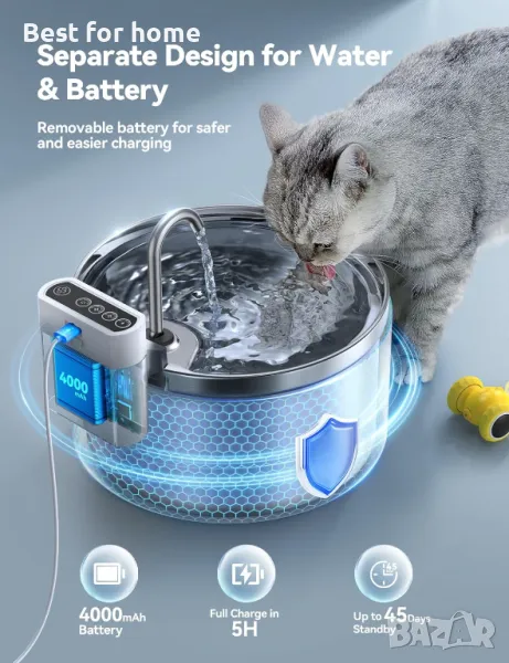 Безжичен фонтан за вода за котки [Разделяне на вода и батерии] Автоматичен диспенсър за вода за домашни любимци FEELNEEDY от неръждаема стомана, 4000 mAh водни фонтани с батерии за котки, кучета - 3,5 л/118 унции. 【Дизайн за разделяне на водата и батерията】Нашият подобрен безжичен фонтан за вода за котки разполага с отделни компоненти за вода и батерия за повишена безопасност в сравнение с вътрешните батерии, просто отделете батерията и я заредете независимо. С тава за вода с капацитет 200 ml, тя осигурява достатъчно хидратация за вашите домашни любимци по време на прекъсвания. Напълно заредена батерия от 4000 mAh може да работи до 45 дни (в автоматичен режим), капацитет от 3,5 л отговаря на нуждите от вода на възрастна котка за 10-13 дни, осигурявайки ви спокойствие по време на пътуване.