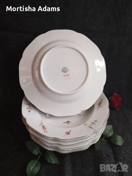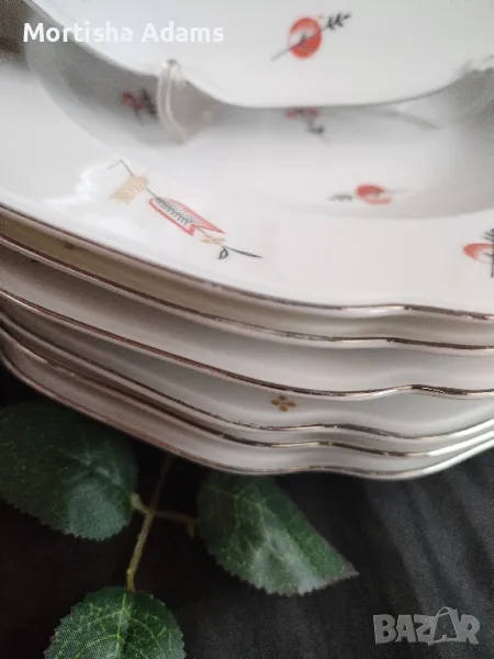 ⚜️ Разкошен комплект от седем чинии- фин, лек, прозрачен порцелан с бял цвят, нежна декорация и платинен кант. Период на производство 1918- 1938г. Чиниите са здрави, минимални драскотинки (по- скоро следствие от съхранение една в друга, отколкото от употреба), дребни несъвършенства на канта и незначителни фабрични.
