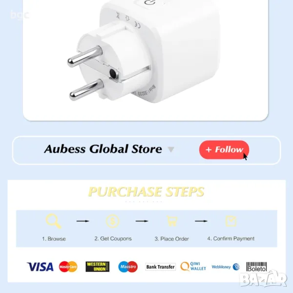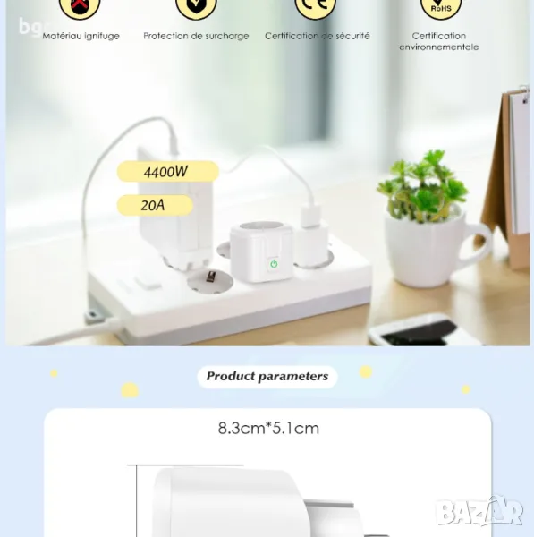 - Безжичен WIFI умен контакт с управление през TUYA SMART или Smart Life през Adnroid и iOS.