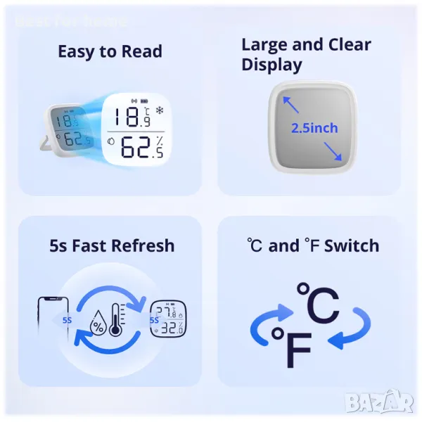 Сензорът за показване на температура и влажност Sonoff разполага с 2,5-инчов LCD екран с големи, смели показания за температура и влажност. Той е съвместим с Zigbee 3.0 шлюзове като Sonoff Zigbee Bridge Pro, Sonoff NSPanel Pro, Sonoff ZBDongle-P/E и Alexa с вграден Zigbee Hub. Това устройство е идеално за наблюдение на температурата и влажността във вашия дом, за да осигурите комфортна среда за живеене. Иконите на екрана показват дали въздухът е горещ, студен, сух или мокър, като ви подканват да настроите съответно своя овлажнител или изсушител. Можете да използвате приложението, за да наблюдавате сензора за дисплей за температура и влажност Sonoff SNZB-02D. Това ви позволява да проверявате текущите условия на LCD дисплея и да проследявате данни в реално време и исторически данни на вашия телефон. С покритие до 120 м (при идеални условия без препятствия), винаги можете да проверите най-новите данни. Освен това, ако температурата или влажността надвишат предварително зададения диапазон, ще получите незабавен сигнал от приложението. Освен това данните за температурата и влажността могат да се разглеждат по ден, месец и година. Графиките на полугодишната крива предоставят ясна картина за това как се променят данните. Можете да експортирате данни като .CSV файлове. Сензорът може да се настрои като тригер за устройства като овлажнители или изсушители, осигурявайки оптимален комфорт по всяко време.