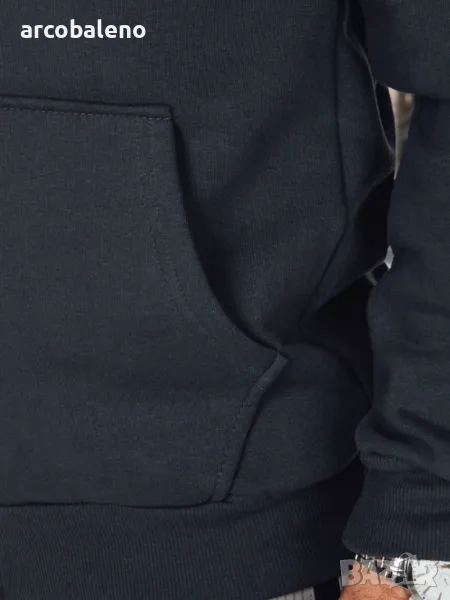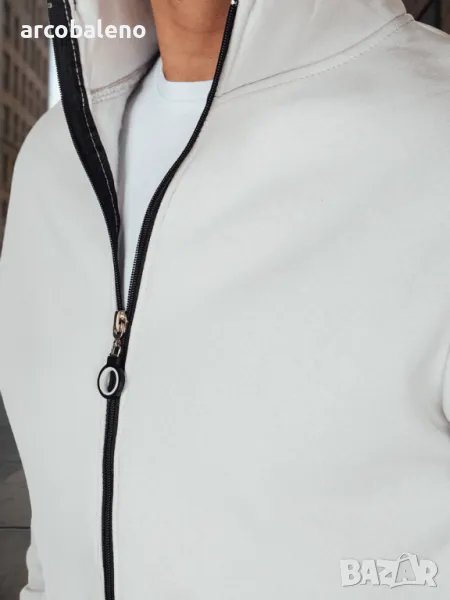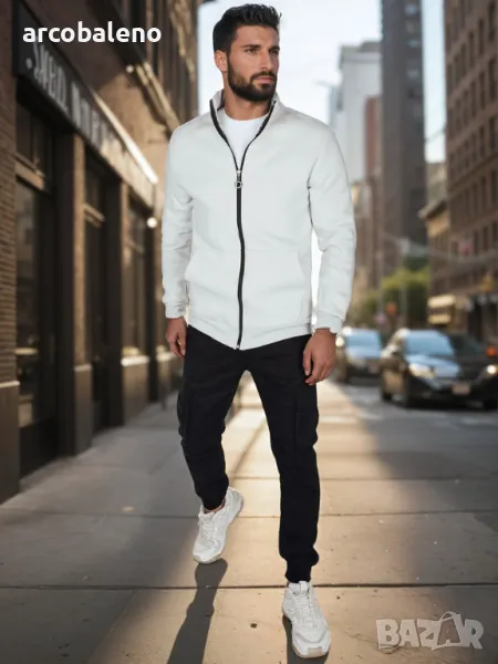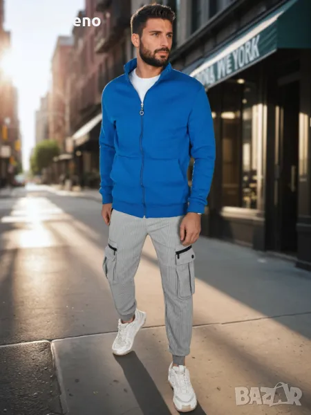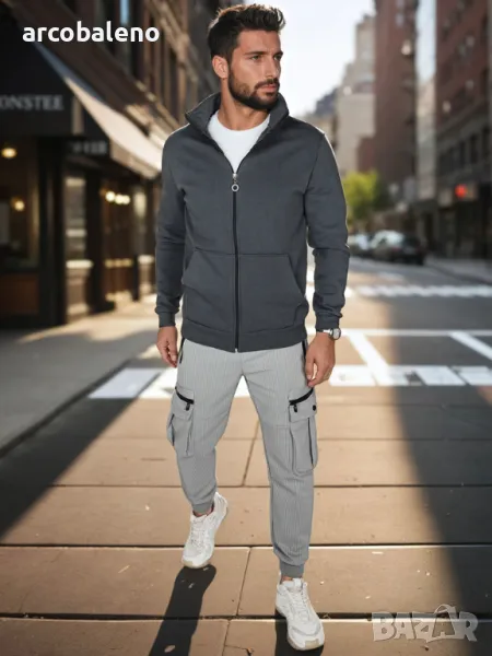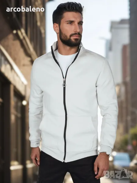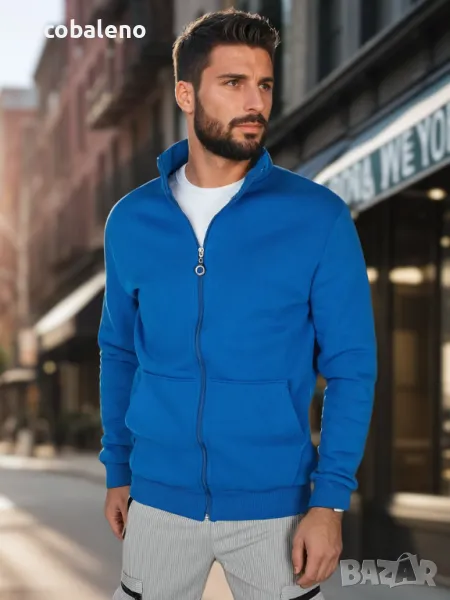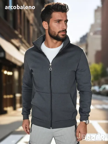 Мъжки суичър с яка и цип, класическа кройка и удобен стил е идеална основа за ежедневен стил. Еластичните маншети и подгъва придават спортна нотка. Кенгуру джобът осигурява практично място за дребни предмети, а липсата на качулка го прави чудесно прилягане под яке или жилетка.