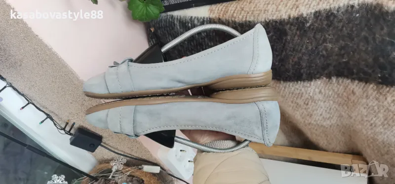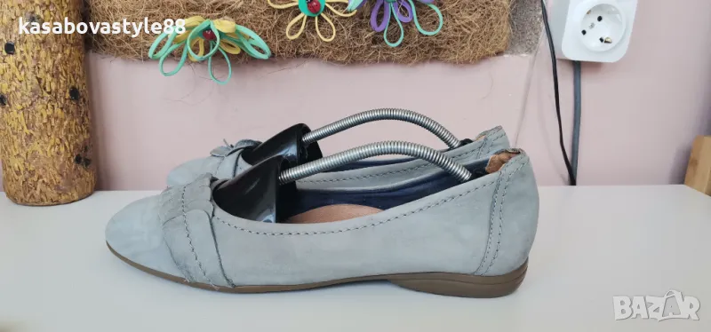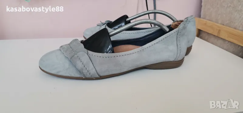 Балерините са в отлично състояние. Те са изработени от естествена кожа в светло-син цвят. Отвътре са с текстил и комфортна кожена стелка. Отговарят на 39 н. Дължина на стелка 25.6см.Ходило 2см.Цялостна височина отзад 9см.