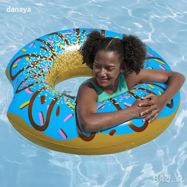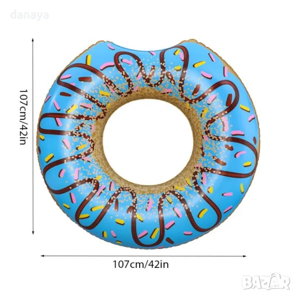 Голям надуваем пояс поничка. Страхотен дизайн с форма на отхапана поничка, която привлича вниманието около вас. Поясът с форма на поничка е изработен от висококачествен траен винил, устойчив на надраскване и разкъсване, не избледнява от слънцето. Предпазен винтил.