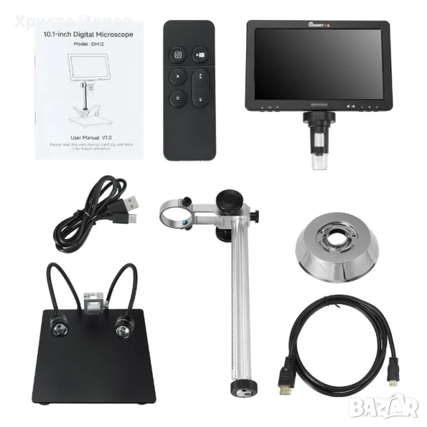 Пакетът включва HDMI кабел, USB кабел, светлоотразителен капак и дистанционно управление, които допринасят за лесното и удобно използване на микроскопа.