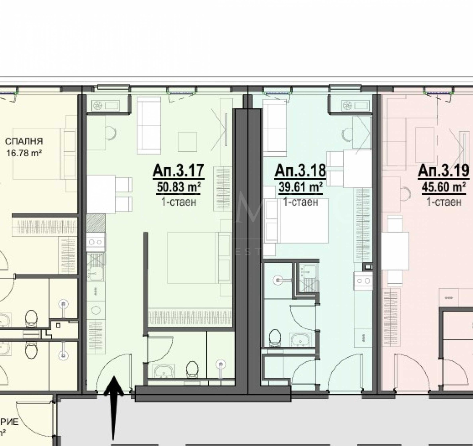 Апартаментът е ситуиран на 3-ти етаж от общо 15 и предлага обща площ 66.34 кв.м (нетна площ 50.83 кв.м + общи части 11.63 кв.м), има и мазе от 3.88 кв.м.