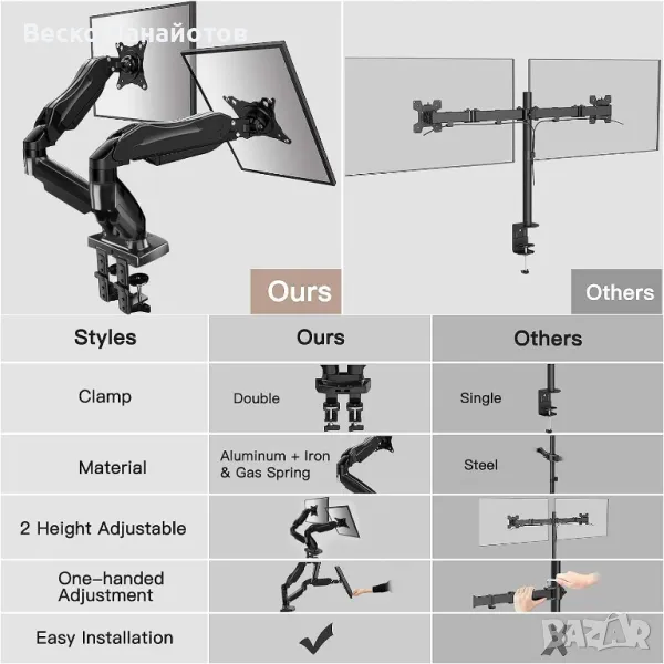 - По-безопасна и по-здрава стойка за двоен монитор: Нашата стойка за двоен монитор е изработена от висококачествен алуминий, отлят под налягане и рамка от сплав, което я прави по-здрава от типичните стойки за монитор от желязо. Този здрав дизайн осигурява надеждна опора за два монитора, всеки между 13 и 32 инча, с общ капацитет на тегло до 9 кг. Бъдете сигурни, безопасността вече не е проблем.