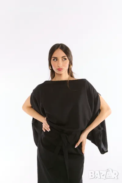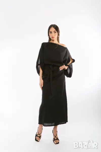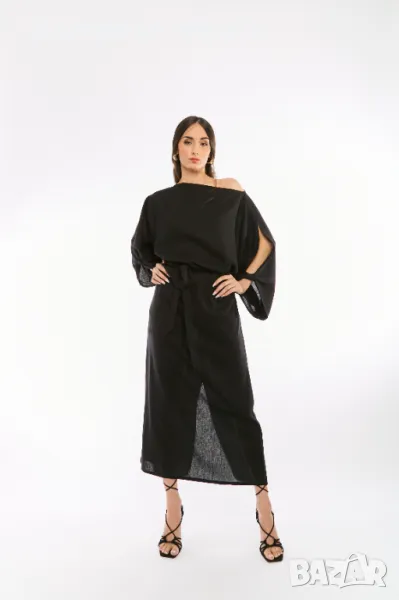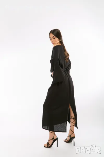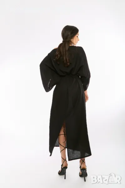 Дълга ленена рокля тип-кимоно, с цепки на ръкавите, коланче и странични джобове.