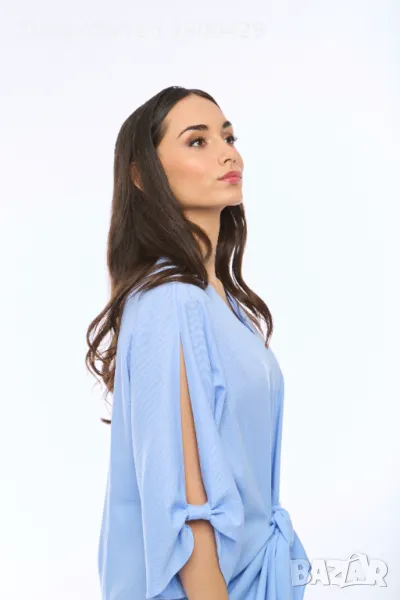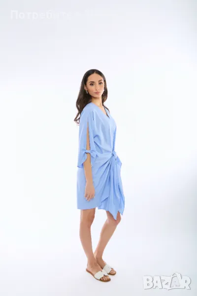 Ленена рокля в небесно син цвят, с тик-так скрито закопчаване и декоративен възел в предната част, който допълнително може да втали силуета.