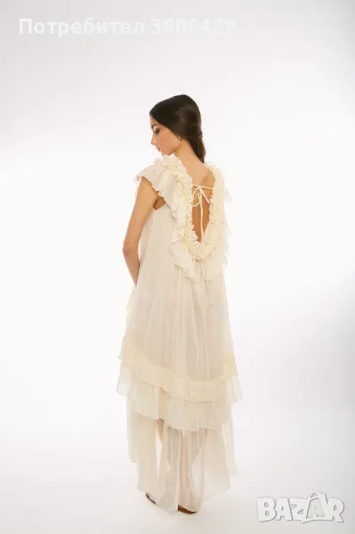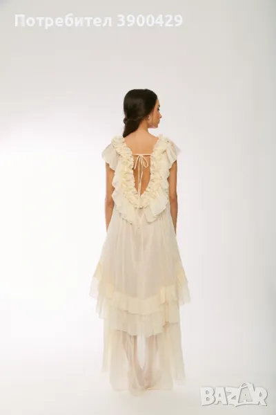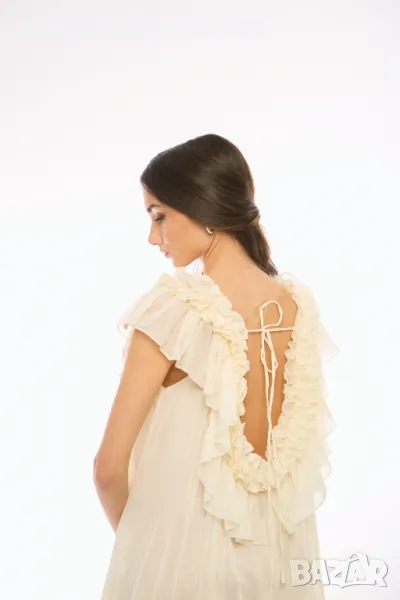С обло деколте и впечатляващ гръб с къдри и нежни връзки.
