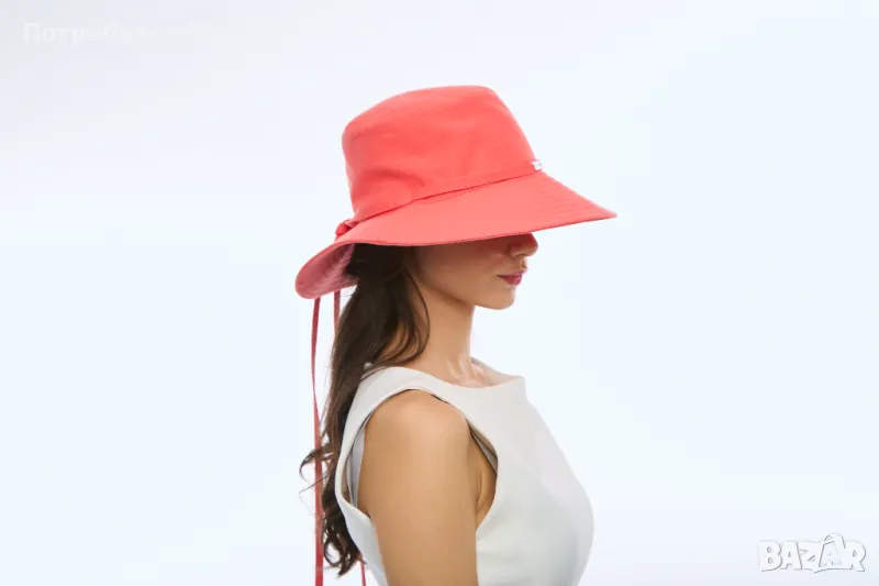 Шапка с голяма периферия, изработена от памучен плат, с декоративни тегели.